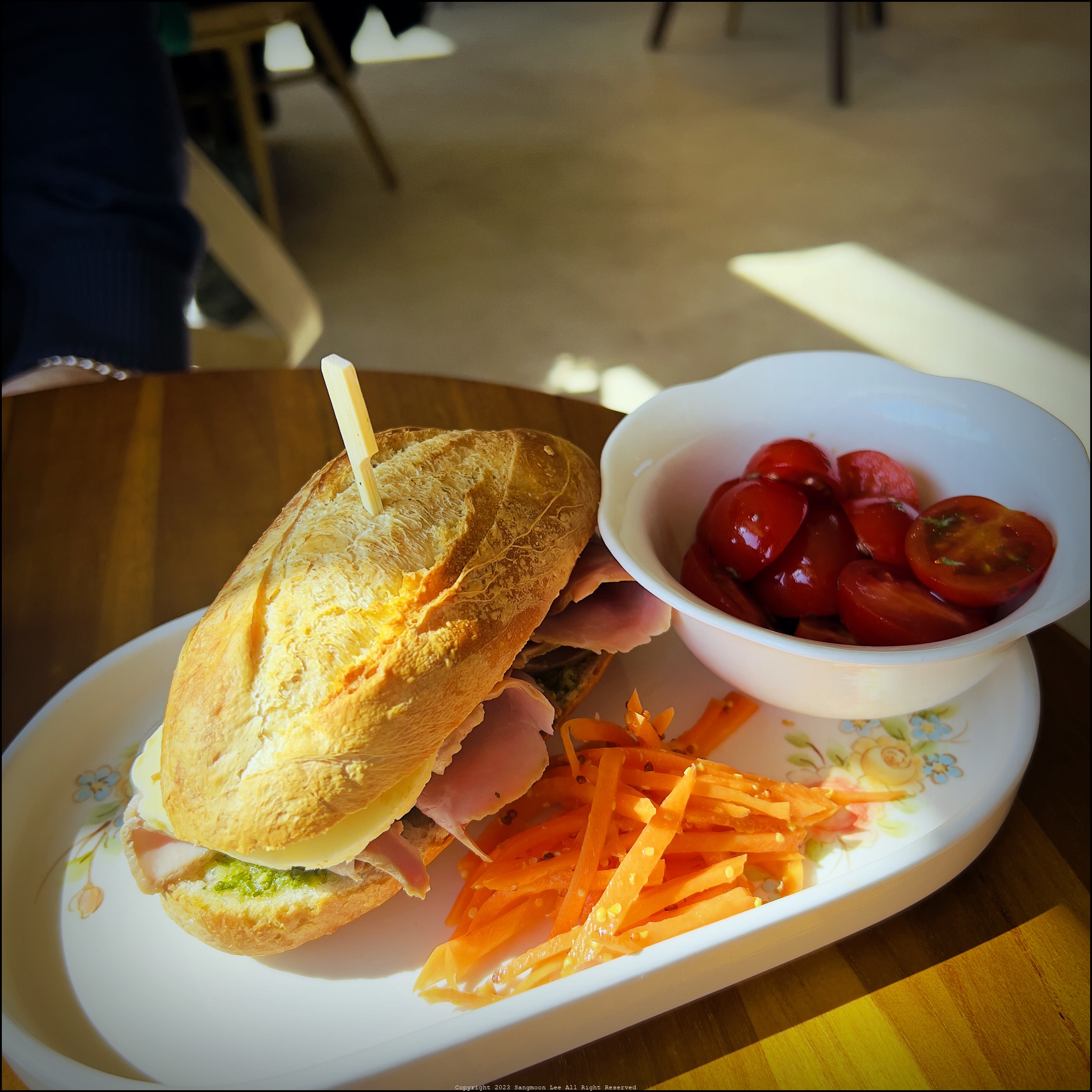 겉이 바삭거리는 바게뜨의 식감도, 페스토도, 그리고 사이드의 당근 셀러드, 그리고 방울토마토까지...