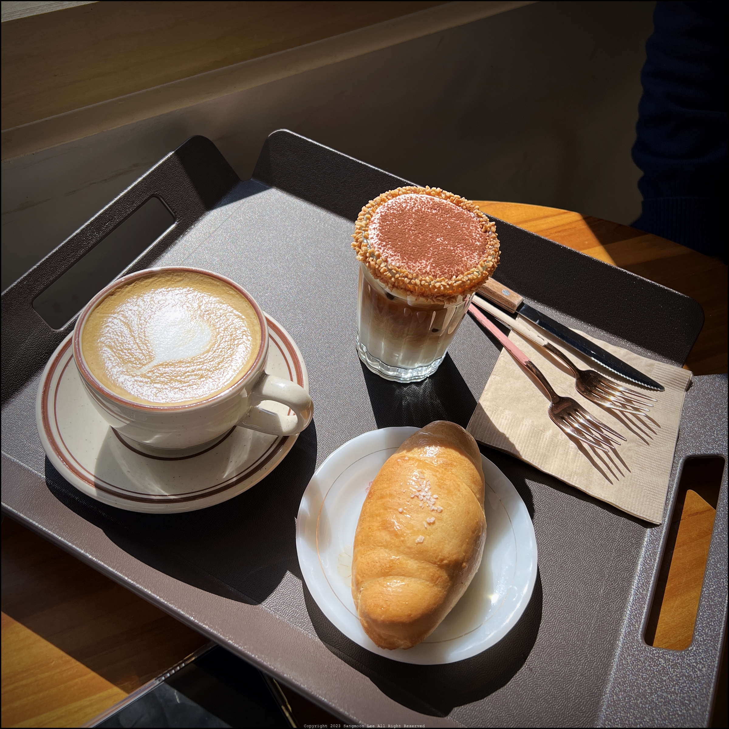 그런데 브런치 메뉴로 있던게 "잠봉뵈르"가 있어서, 케익은 안하고 소금빵 하나랑, 마나나커피, 얼그레이라떼, 그리고 장봉뵈를 주문했다.