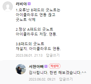 2. 두 대의 아이패드는 동일하게 아이클라우드 연동을 한 상태였고, A 패드에서 수정한 내용이 B패드에 동일하게 동기화되어 나타나는 것이 너무 더뎠고, 혹시라도 양쪽에 서로다른 내용을 적으면 동기화도 안되었고, 페이지간 이동오 안되었씁니다.