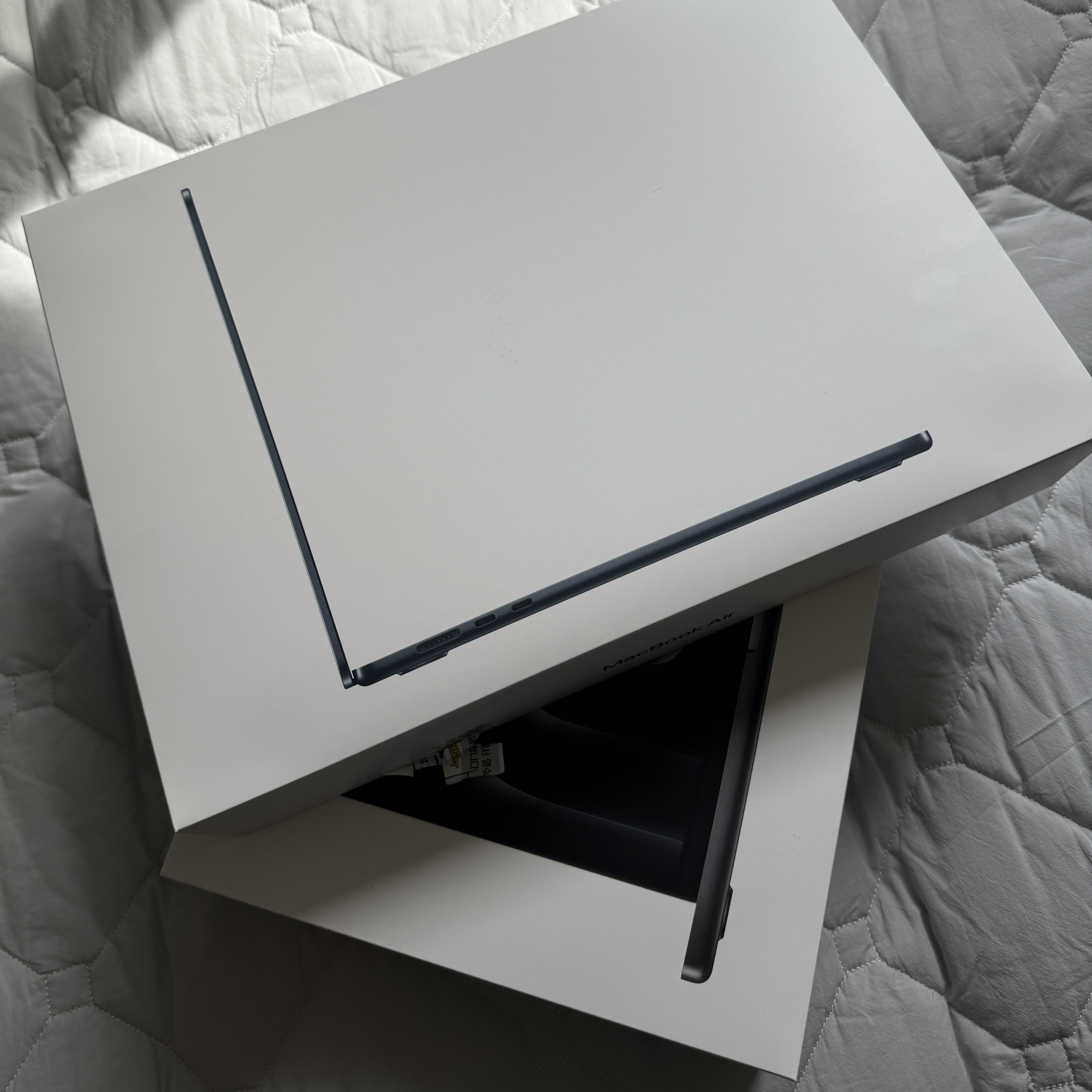 맥북에어 15인치 2024 모델... 케이스부터 차이가 난다. 요넘은 그냥 일렉트로마트에 가서 집어왔다. 기다리기 싫더라구...