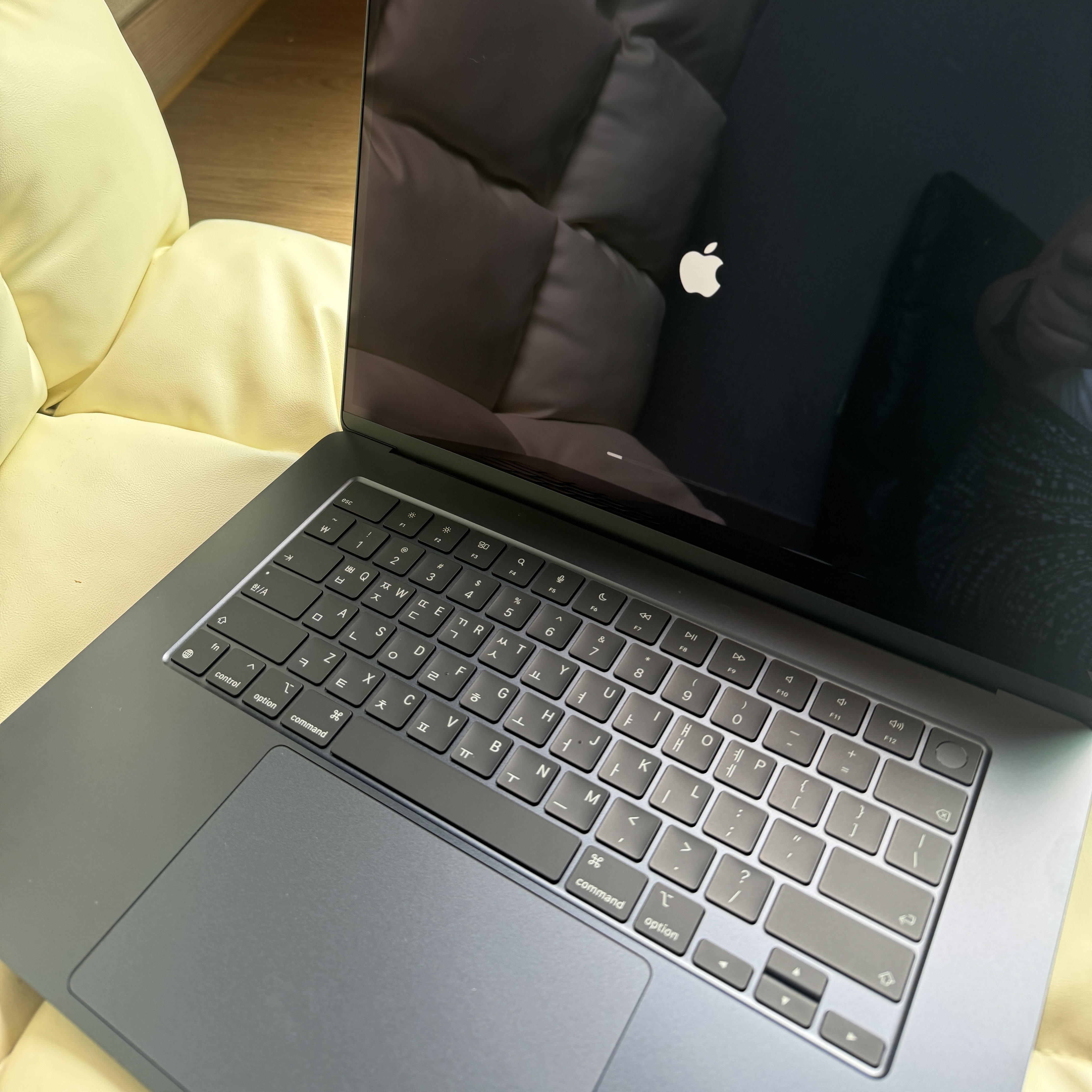 지문이 좀 묻어나기는 하지만, 아주 짙은 군청색을 보는 기분이라서 오히려 더 마음에 들었다. 모니터도 15인치라서 넓직한데 맥북에어의 모니터 테두리가 아주 얇아서 무척 넓게 보이는 화면이 정말 좋더라...ㅎㅎㅎ