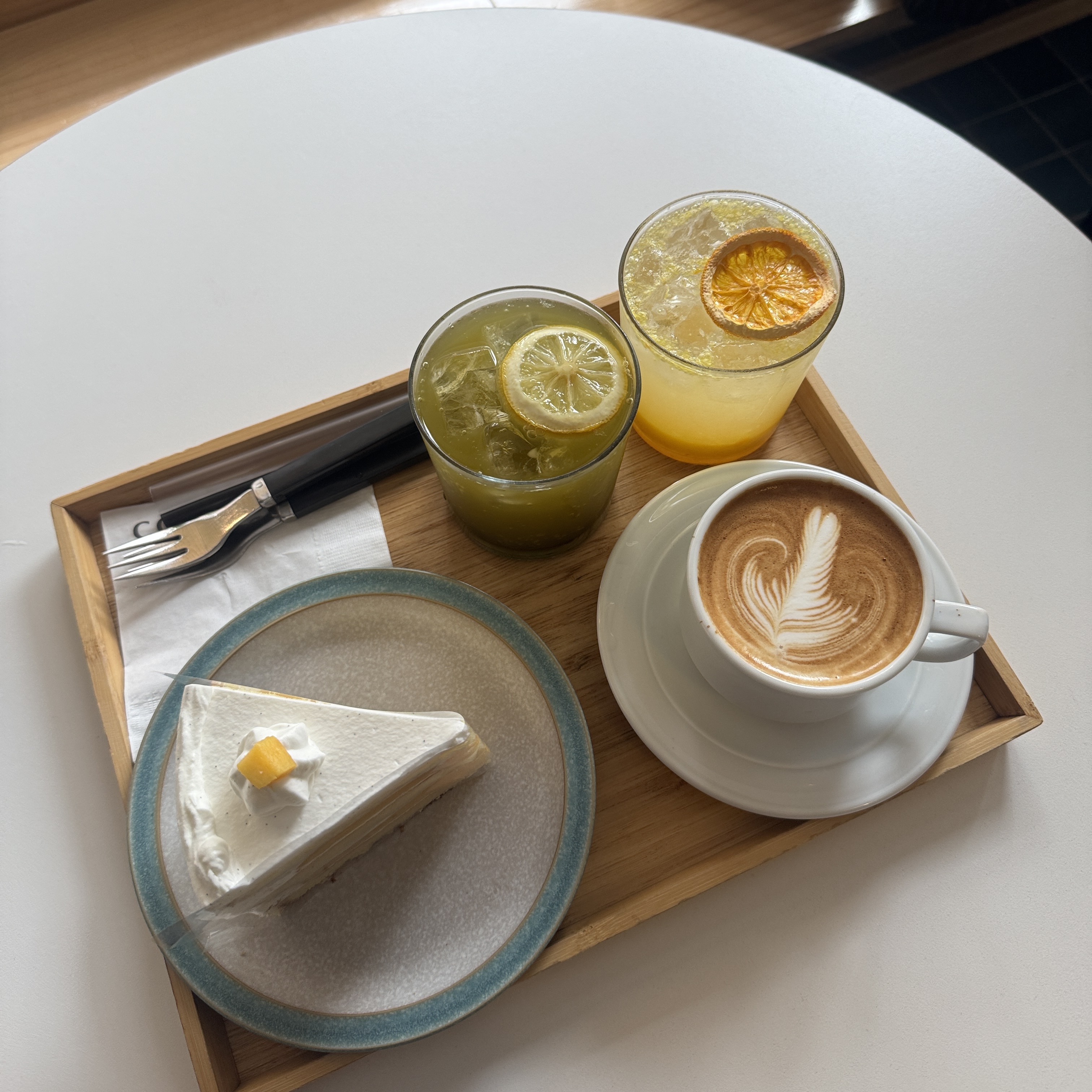 음료도 독특한 것들이 몇개 있던데, 나는 그냥 플렛화이트, 사모님은 오렌지에이드.. 그리고 딸랑구는 말차레몬에이드로 하고, 여기까지 와서 그냥 이것만 먹기는 아쉬우니 망고케익을 시켰다.
